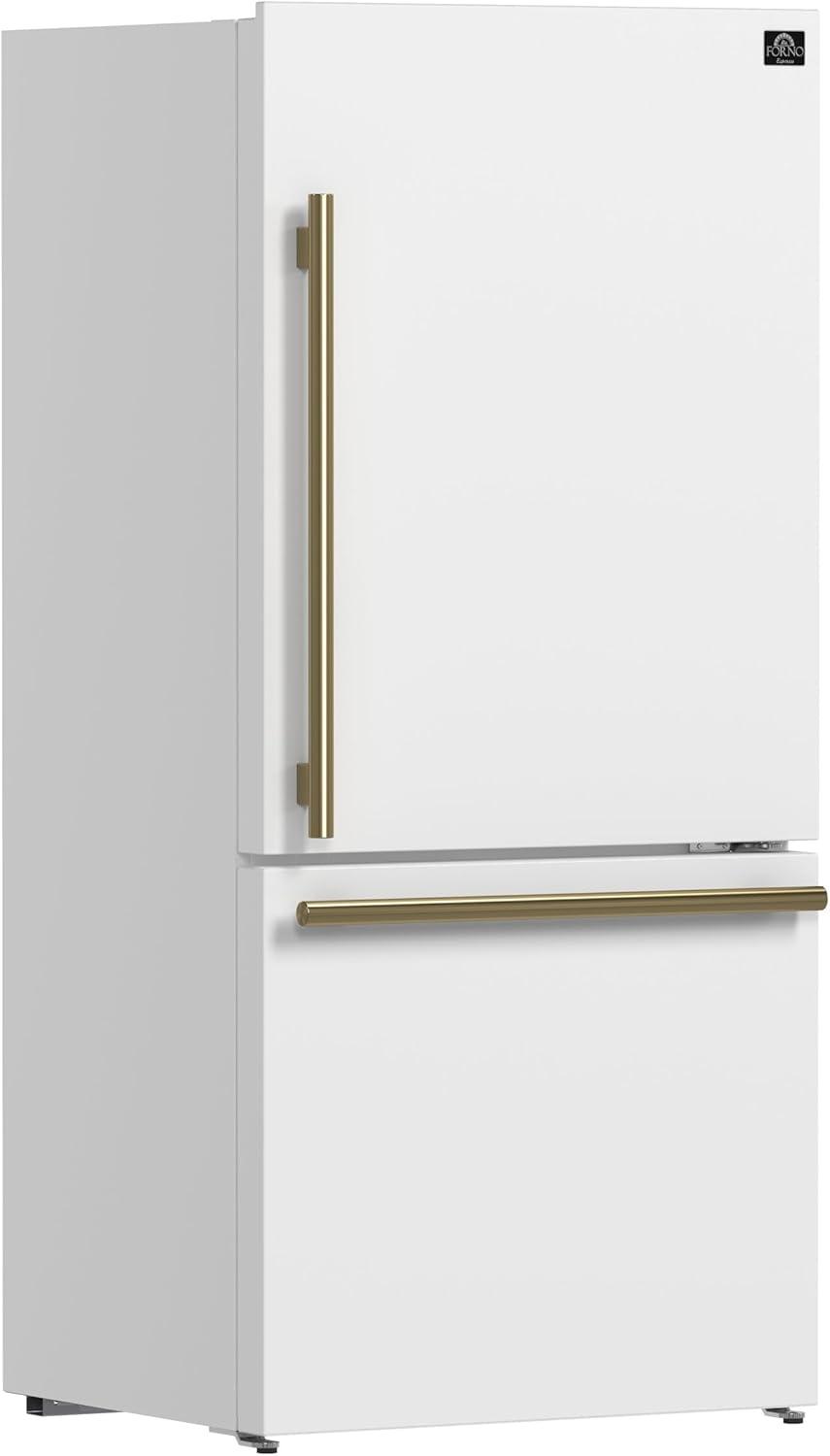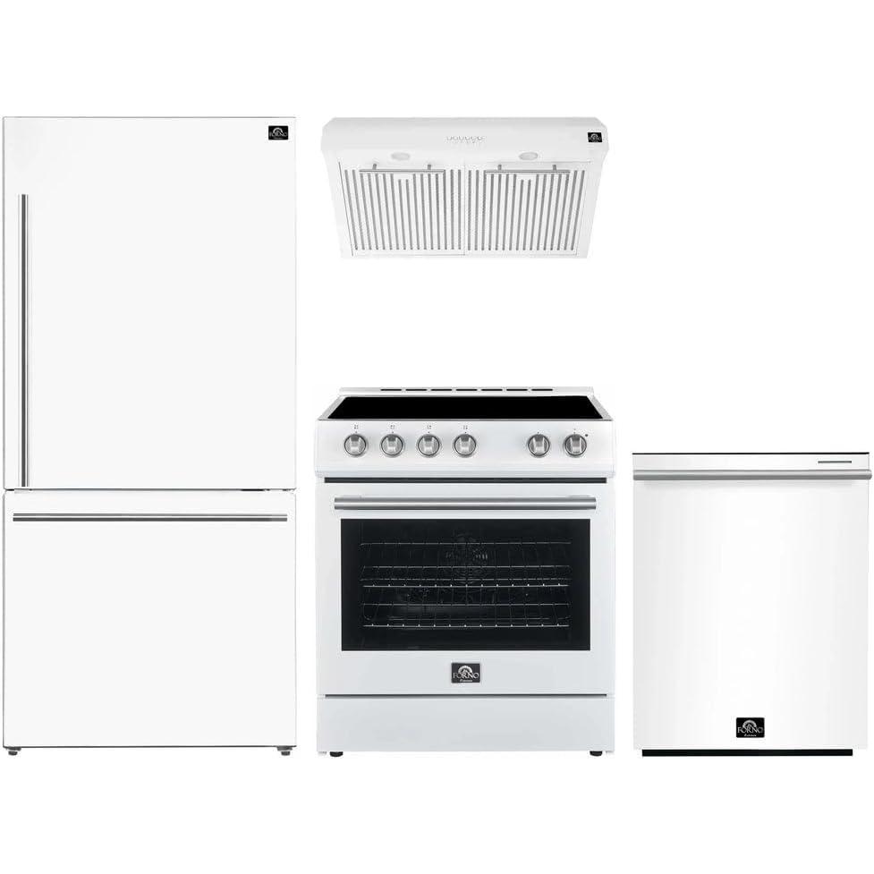Complete Kitchen Package – Includes model FFSEL6012-30WHT 30″ Electric Range, FRHUC5255-30WHT 30″ Range Hood, FFFFD1785-31WHT 31″ Refrigerator with Bottom Freezer, and FDWBI8067-24WHT 24″ Tall-Tub Dishwasher in white with antique brass handles for a coordinated, high-performing kitchen suite.