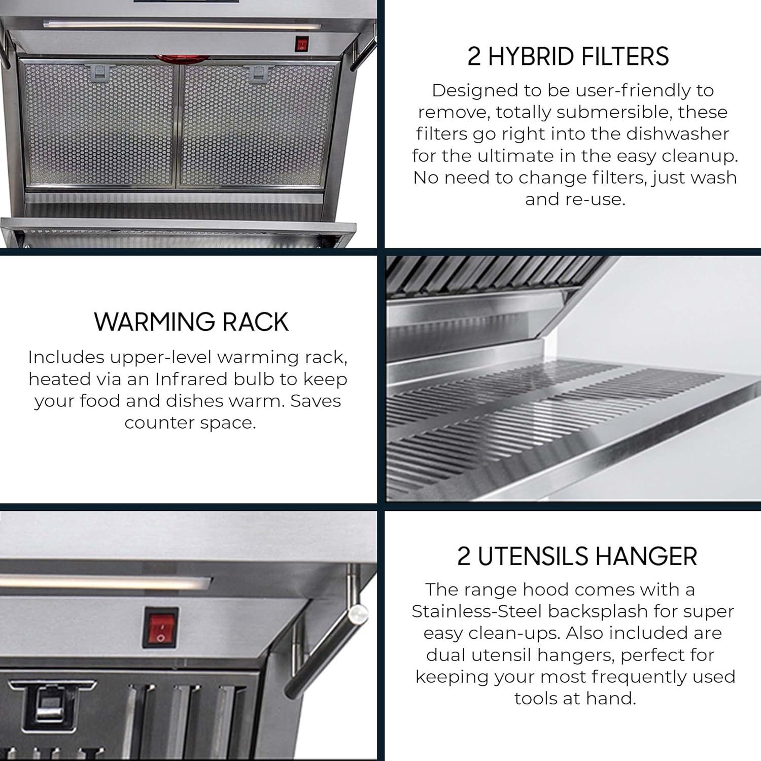 𝐅𝐄𝐀𝐓𝐔𝐑𝐄𝐒: Forno makes this Range Hood with 430-grade stainless steel that will clean easily and remain great looking for years to come. This model comes equipped with pro-style hangers on both sides. Electronic display control with variable 4-speed function and with clock and timer bright white led strip light. Easy installation, Large LED Stripe Light, and Vertical or through back wall installation