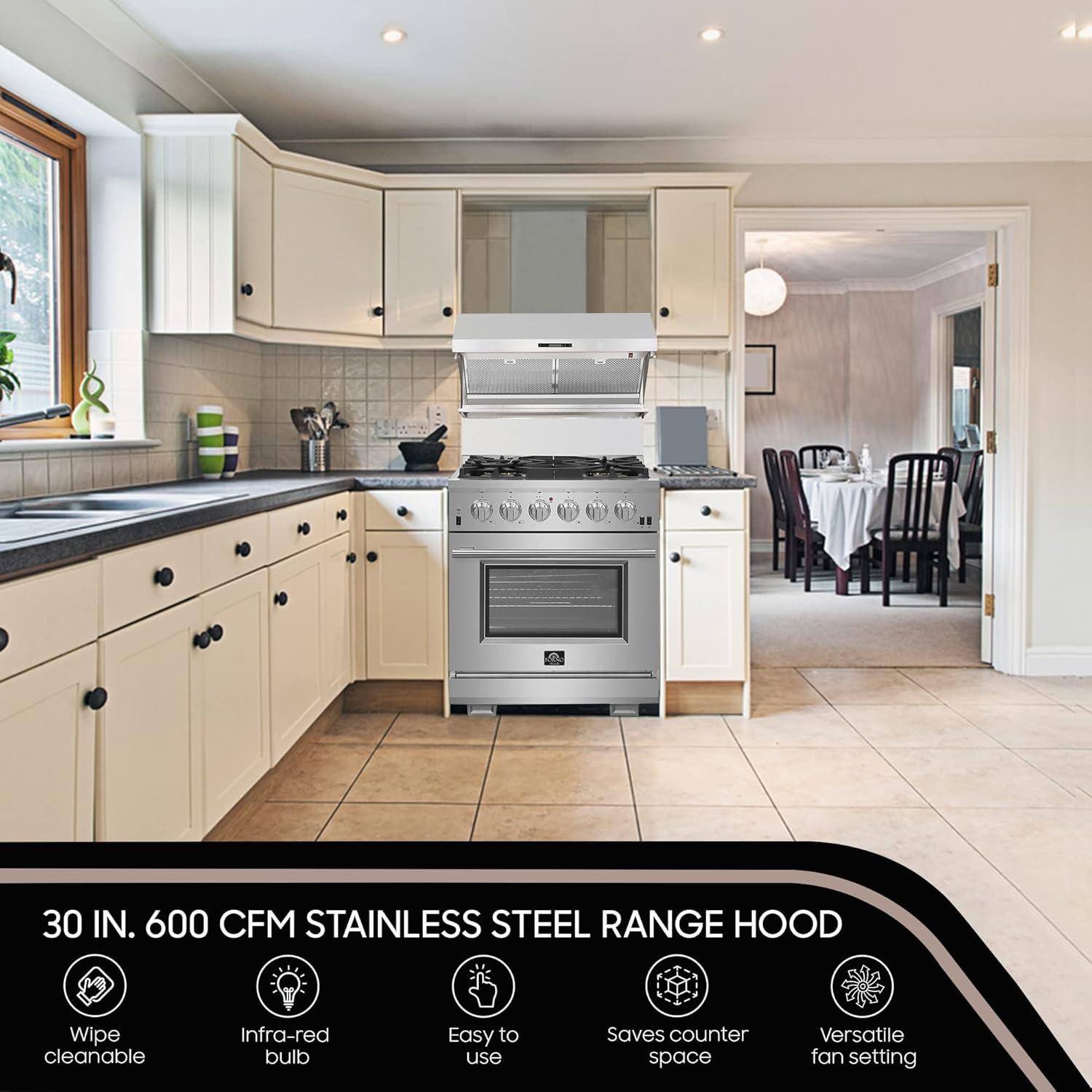 FORNO Savona 30" Inch. Wall Mount Range Hood Back Splash with Top Exhaust Vent - Stainless Steel Kitchen Vent Hood with 600 CFM Single Motors 4 Speeds Touch Control 2 Hybrid Filters and LED Lights