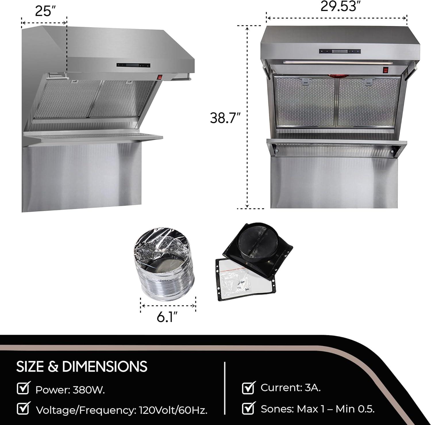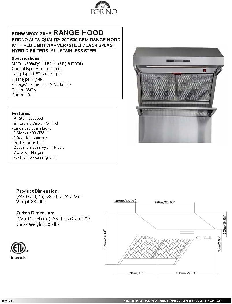 𝐈𝐍𝐂𝐋𝐔𝐃𝐄𝐒: Forno offers this Wall Mount Range Hood and Back Splash 2 Year Factory Parts and Labor Warranty. Circuit Breaker 3 Amps, 380 Wattage, 120 Volt 60Hz, and ETL listings. The Range Hood Overall Dimensions are (W x D x H) (in): 29.53” x 25” x 22.6” Weight: 86.7 lbs and Carton Dimension (W x D x H) (in): 33.1 x 26.2 x 28.9 Gross Weight: 106 lbs