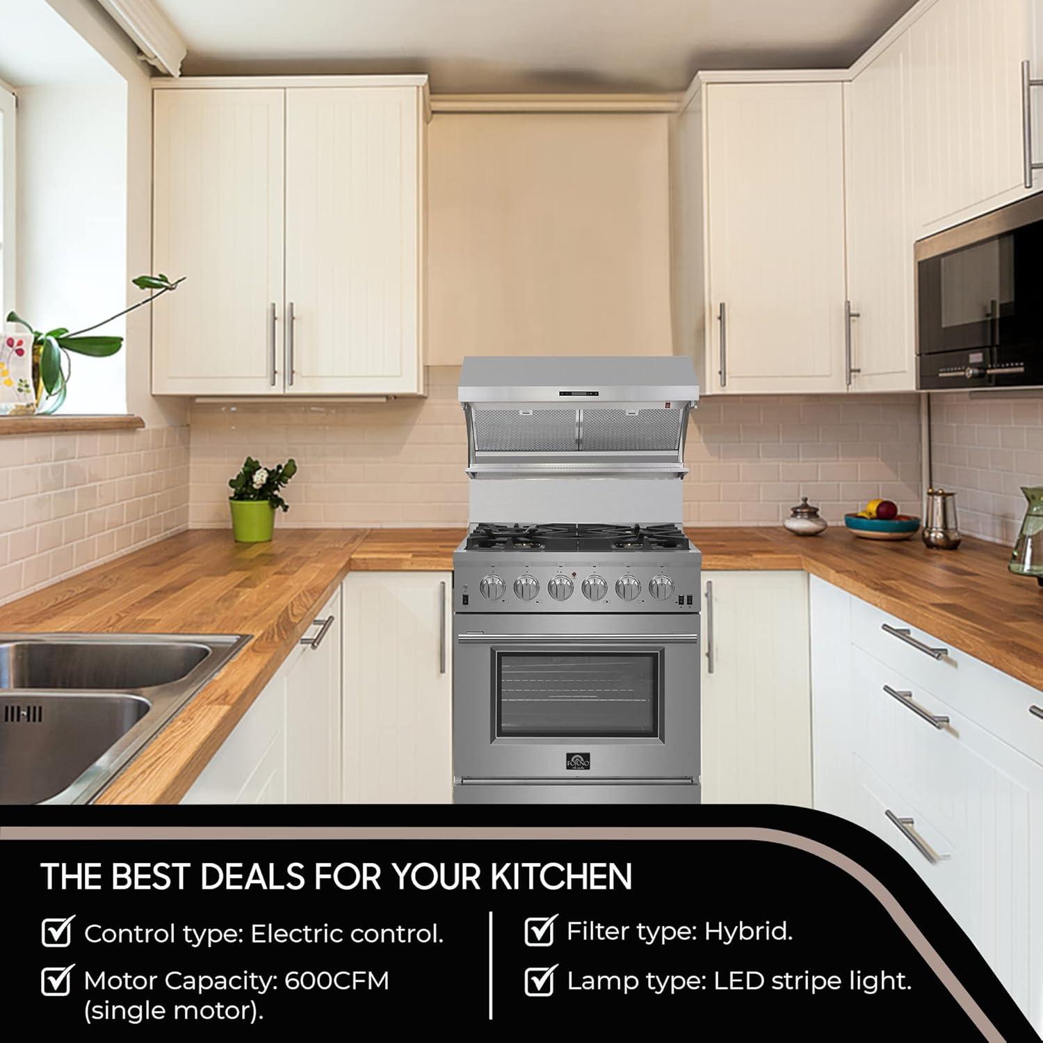 FORNO Savona 30″ Inch. Wall Mount Range Hood Back Splash with Top Exhaust Vent – Stainless Steel Kitchen Vent Hood with 600 CFM Single Motors 4 Speeds Touch Control 2 Hybrid Filters and LED Lights
