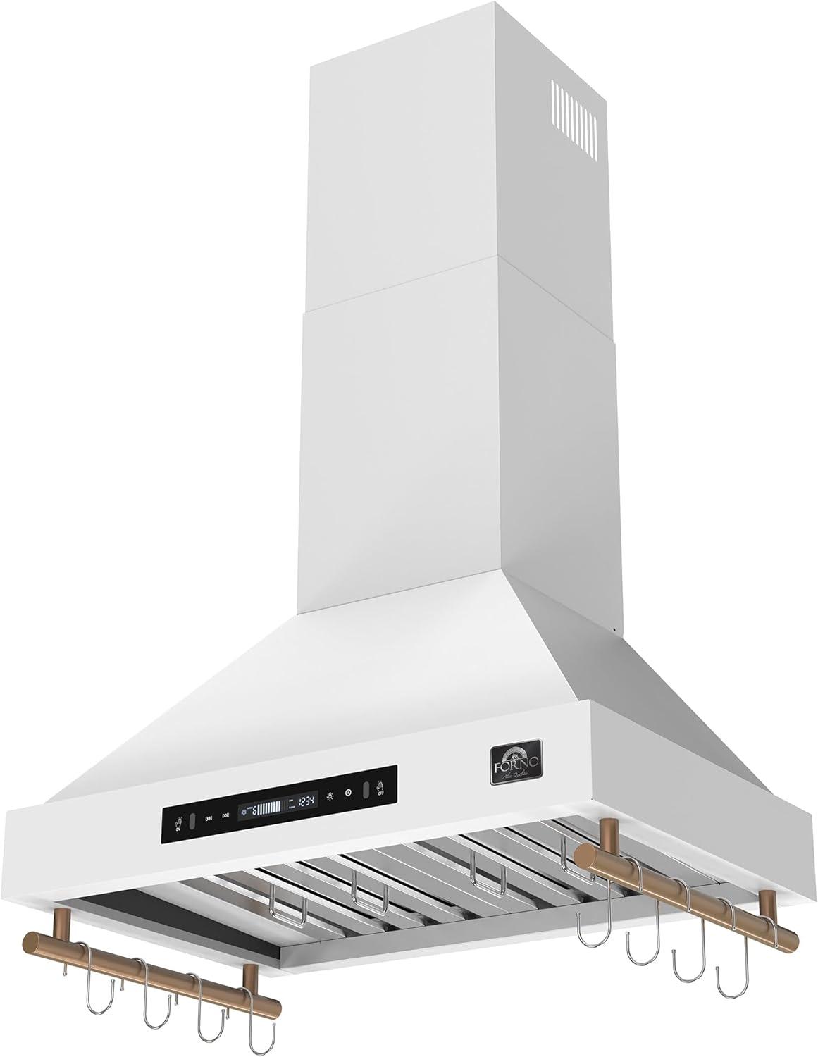 The Forno Venezia 30 Inch Wall-Mounted Range Hood in White, FRHWM5503-30WHT, delivers powerful ventilation and modern style to elevate any kitchen. Featuring three adjustable airflow speeds, it effortlessly handles everything from gentle simmering to high-heat cooking, while sleek touch controls make operation smooth and intuitive. Designed for convenience and flexibility, this range hood includes adjustable height for easy installation, energy-efficient lighting to brighten your cooking area, and dishwasher-safe baffle filters for quick, hassle-free maintenance. Keep your kitchen fresh and comfortable with automatic and delay shut-off functions that continue ventilating after cooking, removing lingering smoke, odors, and steam. Its quiet operation ensures a peaceful cooking environment, even at high speeds, while the clean, modern white finish adds a stylish, contemporary look to any kitchen décor. Installation is simple and adaptable, thanks to the flexible chimney height that fits a variety of ceiling configurations. Stainless steel baffle filters are durable and easy to clean, maintaining high performance and a polished appearance for years. Side hooks on the hood provide convenient storage for lightweight utensils such as spatulas, ladles, or towels, keeping your essential tools organized and within reach—note: only hang light items to avoid damage. Perfect for home chefs and busy families alike, the Forno Venezia Wall-Mounted Range Hood combines efficiency, style, and thoughtful design. Its powerful ventilation, energy-conscious lighting, and quiet operation make it ideal for everyday cooking, entertaining, or preparing elaborate meals. Built with high-quality materials, this range hood offers lasting performance and a professional, modern aesthetic that enhances your kitchen’s overall appeal.
