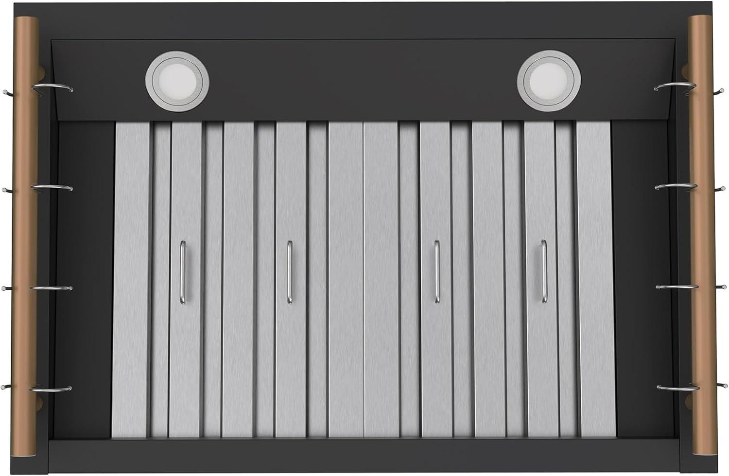 Adjustable Chimney & Quiet Operation – Height-adjustable chimney accommodates ceilings of varying heights for flexible installation. The range hood operates quietly even at high speeds, minimizing disruption in your kitchen, while side hooks provide space for lightweight utensils, keeping tools organized and enhancing overall functionality during cooking.