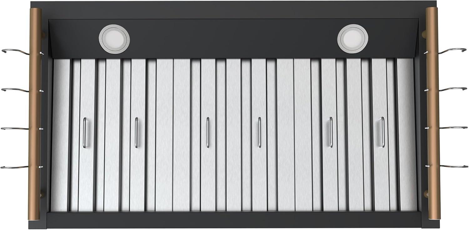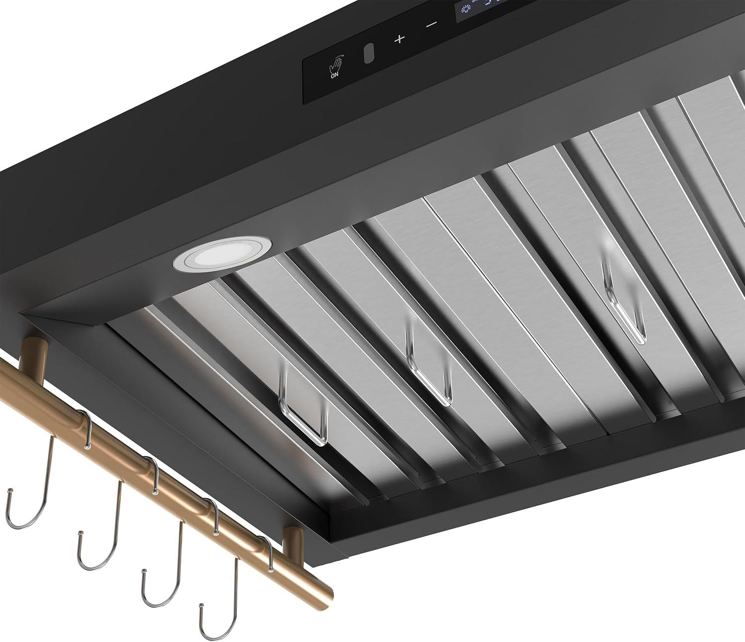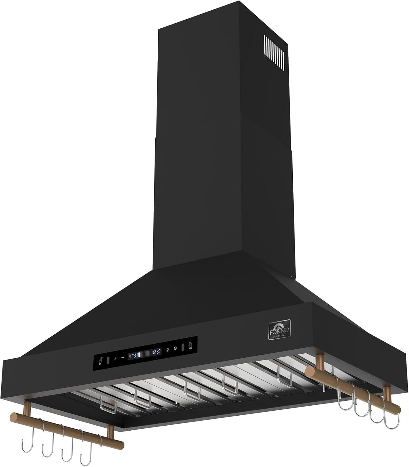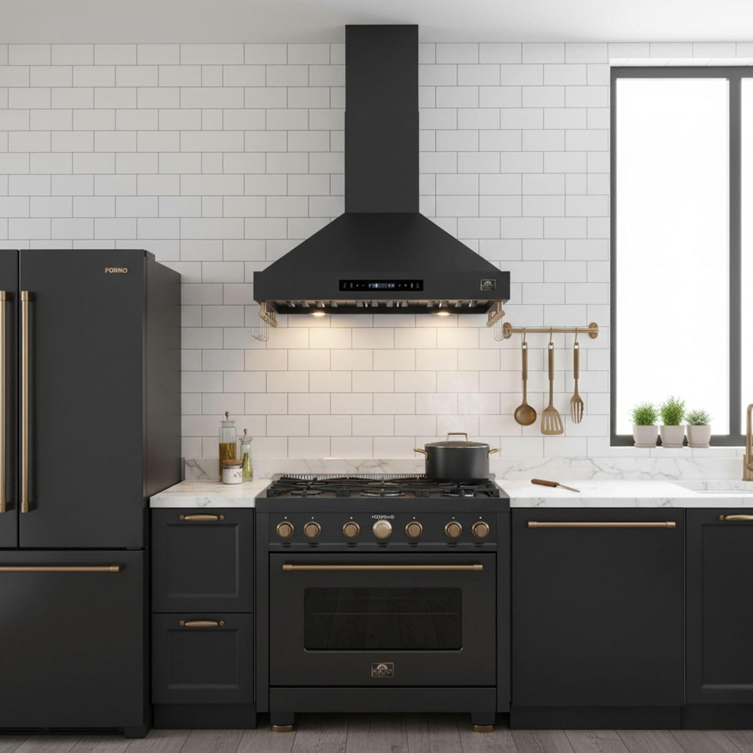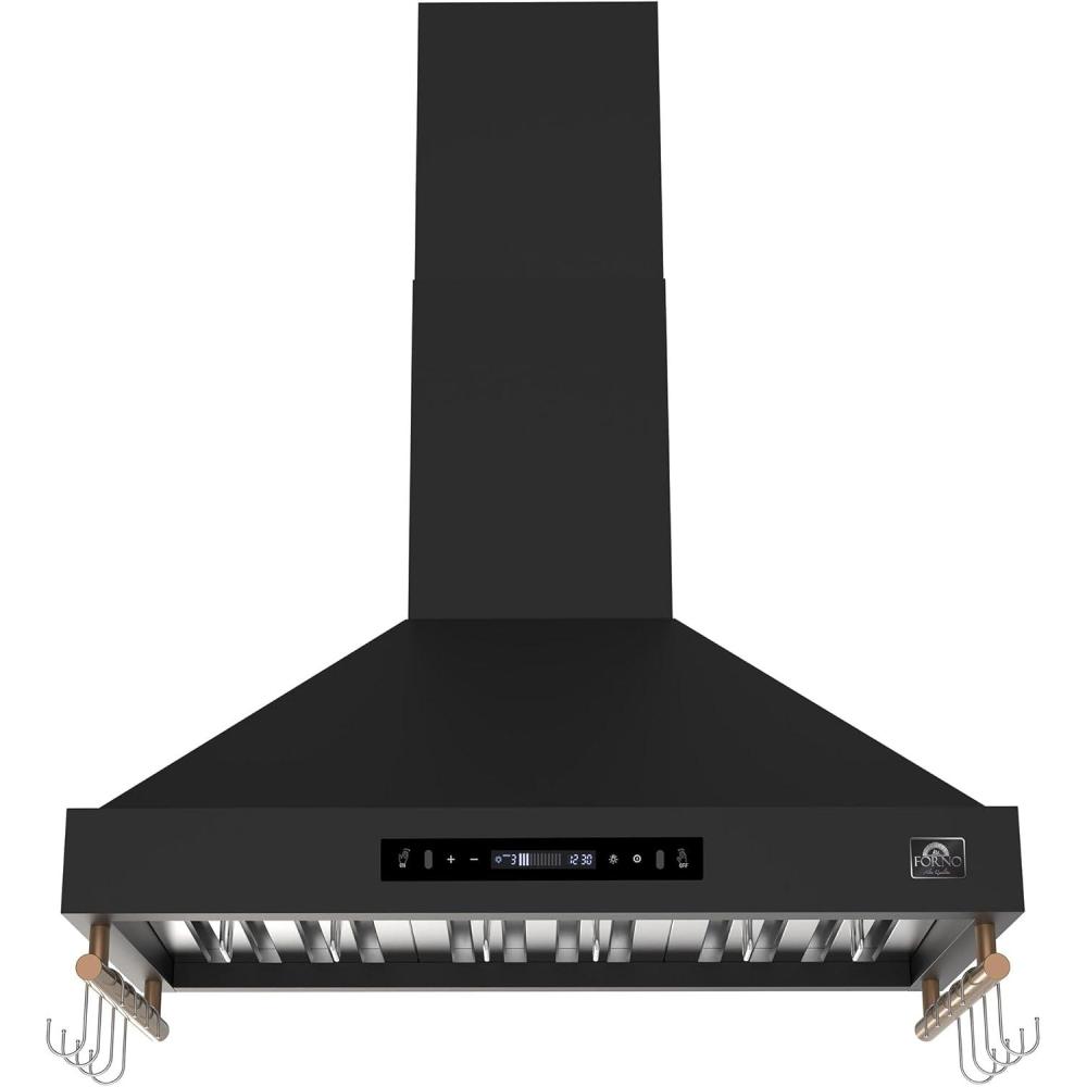 Elevate your kitchen with the FORNO Venezia 36″ 370 CFM Wall Mount Ducted Range Hood in striking Black with Antique Brass Accents, FRHWM5503-36BLK. Combining bold style with high-performance ventilation, this range hood is designed to keep your cooking space fresh, comfortable, and visually stunning. Its sleek touch control panel makes adjusting settings effortless, while energy-efficient LED lights illuminate your cooktop with clarity. Experience precise airflow control with three adjustable fan speeds, ideal for everything from gentle simmering to high-heat searing. The built-in automatic shut-off timer ensures lingering odors and steam are cleared even after cooking, while quiet operation keeps your kitchen serene. Designed with convenience in mind, the dishwasher-safe stainless steel baffle filters simplify cleanup, and side hooks let you keep lightweight utensils within easy reach. Crafted for modern kitchens, the Venezia 36″ range hood features an adjustable chimney height to fit various ceiling configurations. Its ducted design delivers powerful ventilation up to 370 CFM, with a round 6″ duct and low-noise performance ranging from 44.3 to 58.3 dBA. At 35.2″ W x 19.7″ D x 47.4″ H and weighing just 33.6 lbs, installation is straightforward, with all necessary power cords and a NEMA 5-15P plug included. Upgrade your cooking experience with a range hood that seamlessly blends functionality and sophistication. Whether paired with the FORNO Marco 36″ Gas Range, FFRBI1820-36BLK Refrigerator, or FDWBI8067-24BLK Dishwasher, FRHWM5503-36BLK enhances your kitchen with unmatched style and performance. Certified ETL and backed by a 2-year parts and labor warranty, this wall-mounted range hood delivers lasting reliability.