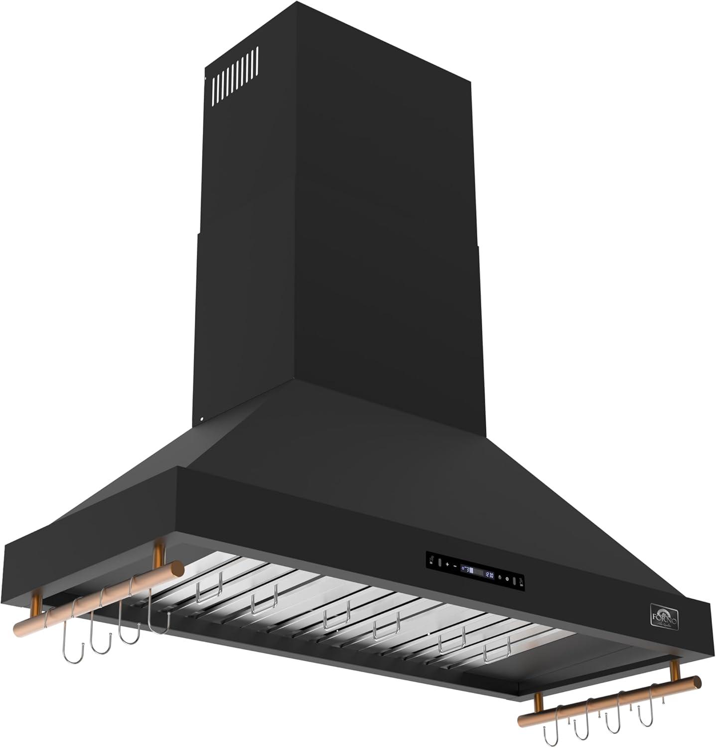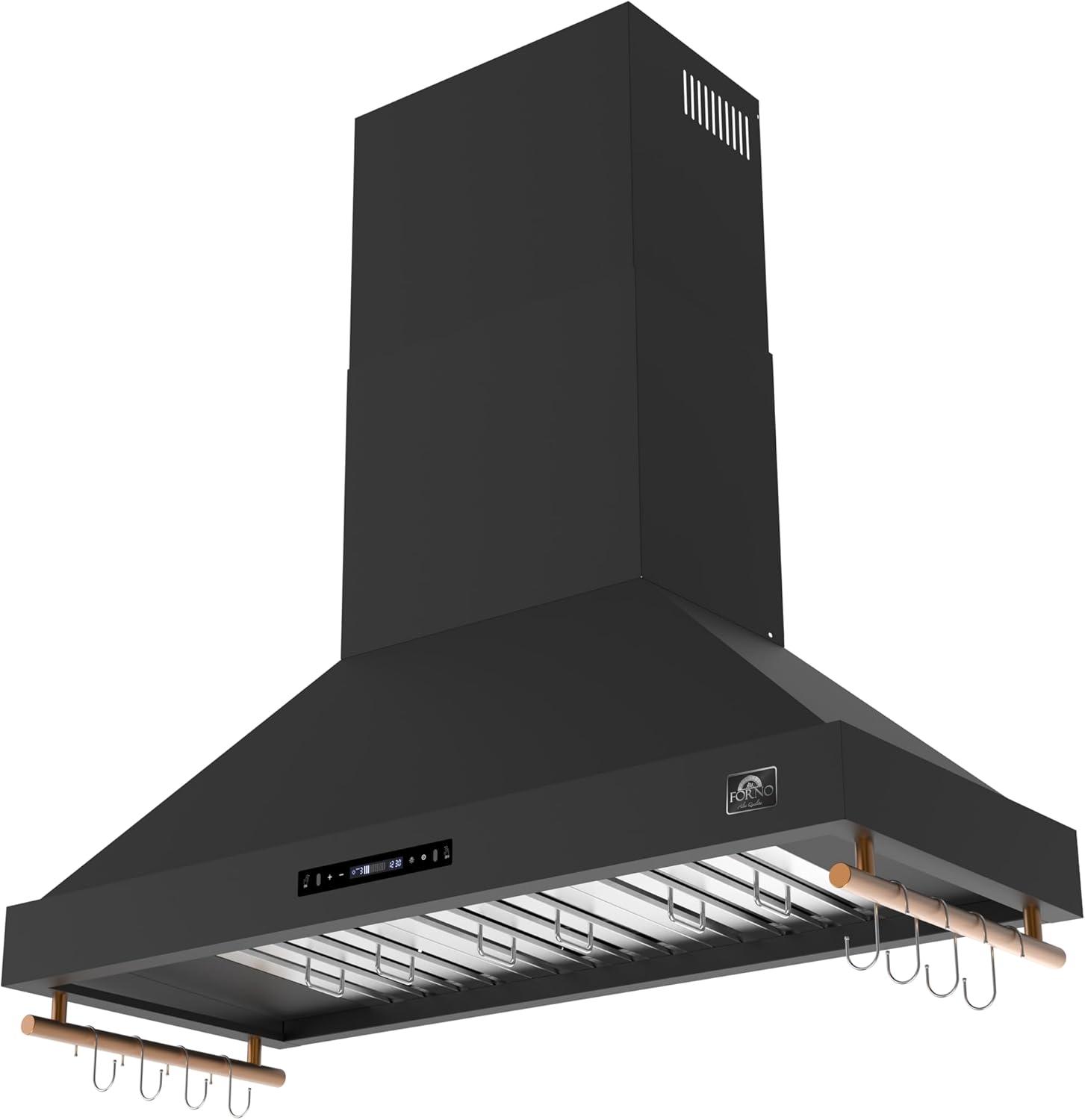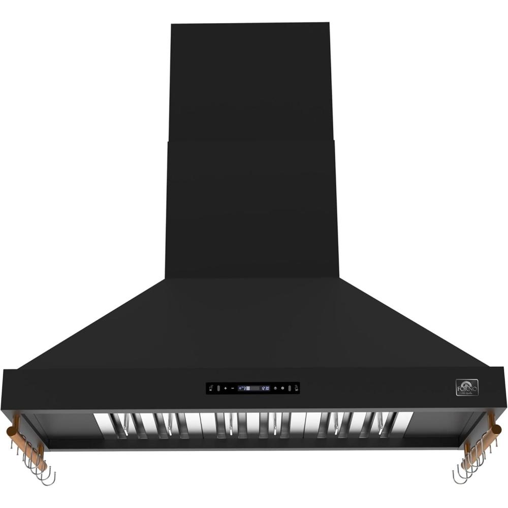 Elevate your kitchen with the FORNO Venezia 48″ 900 CFM Wall Mount Ducted Range Hood in Black with Antique Brass Accents, FRHWM5503-48BLK. This striking range hood blends powerful performance with modern design, making it the perfect centerpiece for any culinary space. Three-speed fans provide precise airflow control, whether you’re simmering, sautéing, or searing, while the delay shut-off timer ensures lingering smoke and odors are efficiently cleared. The sleek touch control panel delivers effortless operation, adjusting fan speeds and LED lights with a simple swipe. Energy-efficient LED illumination brightens your cooktop, pairing function with style, while dishwasher-safe stainless steel baffle filters make maintenance effortless. The adjustable-height telescoping chimney accommodates ceilings of varying heights, offering a seamless, custom installation. Designed with convenience in mind, the FORNO Venezia includes side hooks for lightweight utensils, keeping spatulas, ladles, and tongs within easy reach. Its quiet operation, even at high speeds, ensures a comfortable kitchen environment. Bold black finishes accented with antique brass trim provide a sophisticated, contemporary look that complements a wide range of kitchen décor. Compatible with a complete FORNO kitchen suite, pair the Venezia with the FORNO Marco 36″ Gas Range, FFSGS6277-36BLK, the FORNO Espresso Moena 36″ Refrigerator with Ice Maker, FFRBI1820-36BLK, and the FORNO Espresso Pozzo 24″ Built-In Dishwasher, FDWBI8067-24BLK, for a fully coordinated, high-performance setup. Certified ETL Listed and backed by a 2-year parts and labor warranty, the FRHWM5503-48BLK ensures lasting reliability and style for your home.