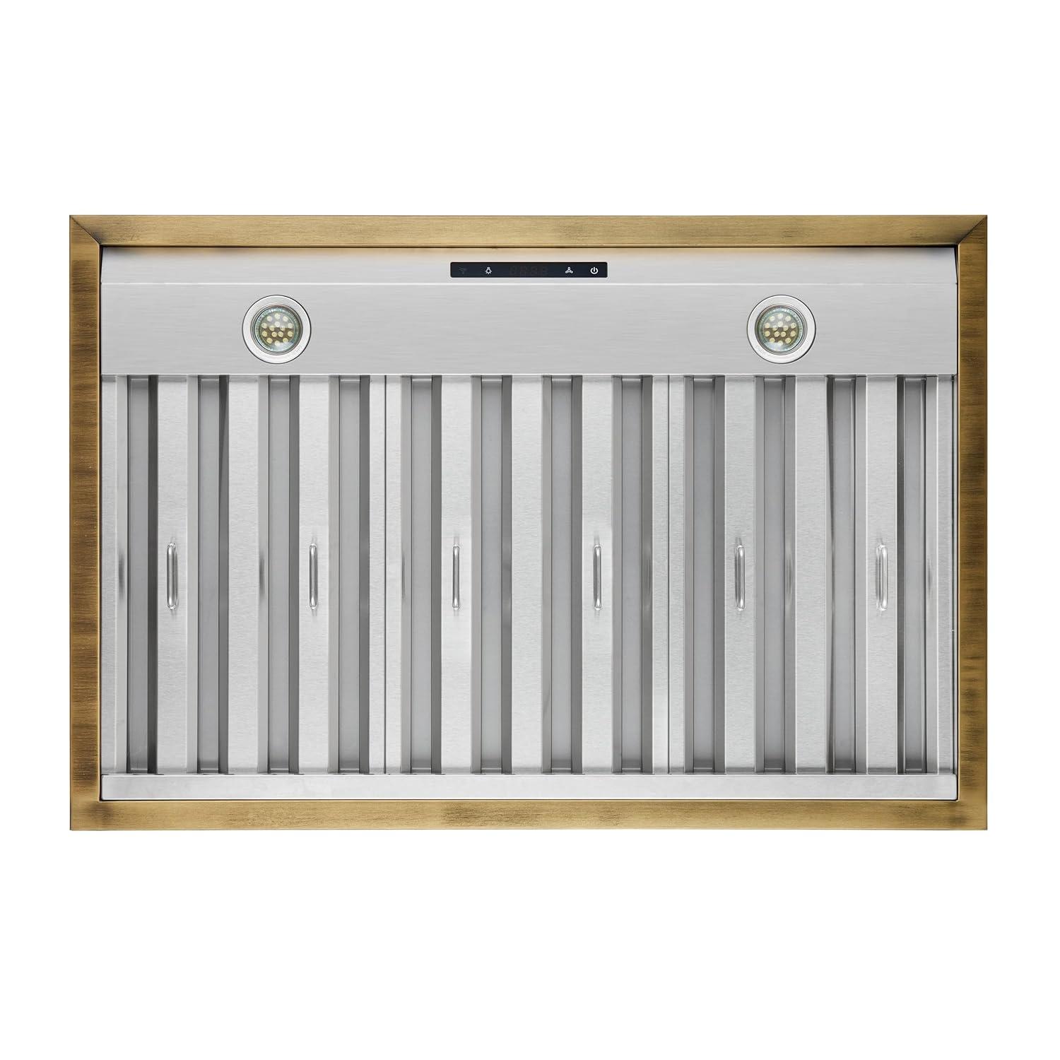 Energy-Efficient LED Lighting – Integrated LED lights provide bright, even illumination of the cooking surface, enhancing visibility during food preparation. Designed for low energy consumption, the LEDs reduce electricity usage without compromising lighting performance. Combined with a sleek white and antique brass design, the hood complements modern kitchen aesthetics while delivering lasting reliability.